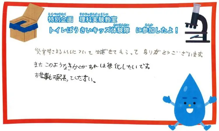 本体験活動への助成金をご援助決定くださいました独立行政法人国立青少年教育振興機構 子どもゆめ基金部助成課のご担当者様、並びに本イベントの講師・サポートを努めてくださいました株式会社サイエンス倶楽部の佐々木様、形本様、並びに災害用品展示品にご協力くださいました株式会社総合サービス 御園様へ深謝申し上げます。